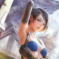 an illustrated character, a girl with short brown hair and blue eyes. She is wearing