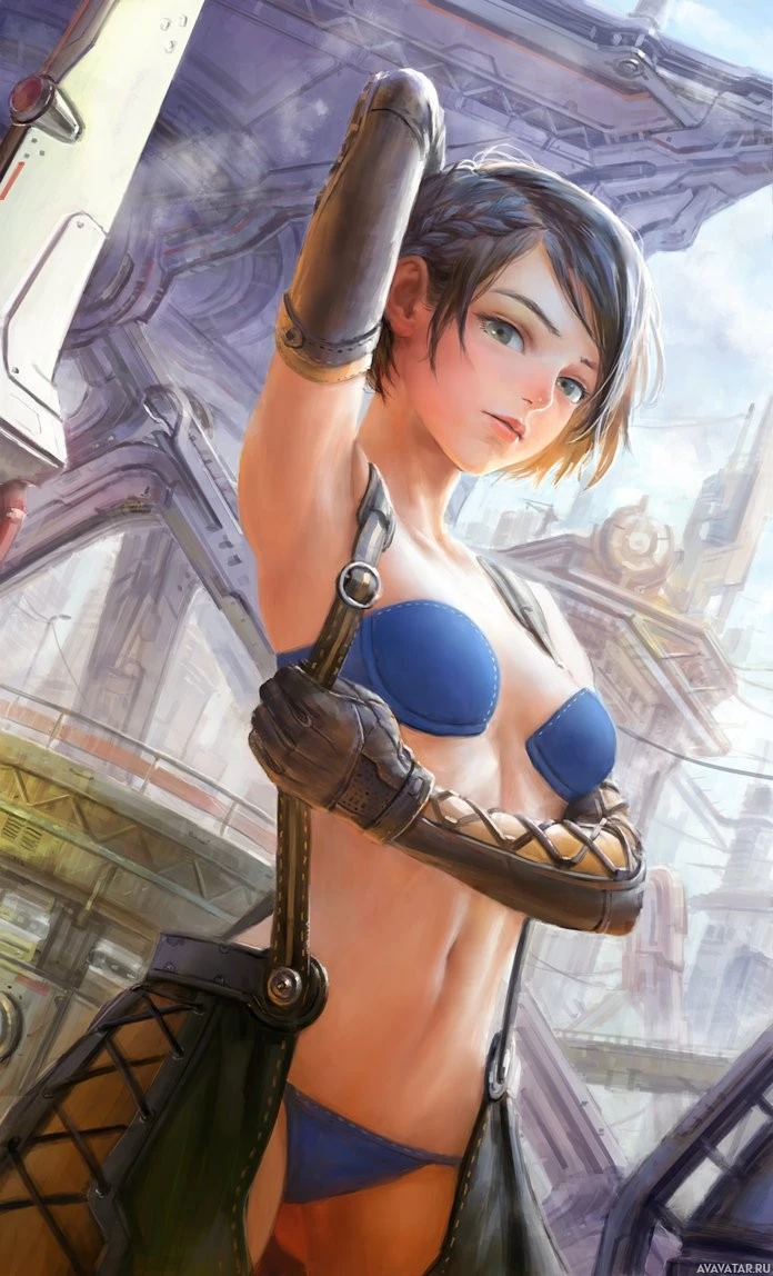 a black top with blue accents, gloves with metallic spikes, and a hip-hop style choker around her neck. Her left hand rests on her hip while her right hand holds what appears to be