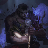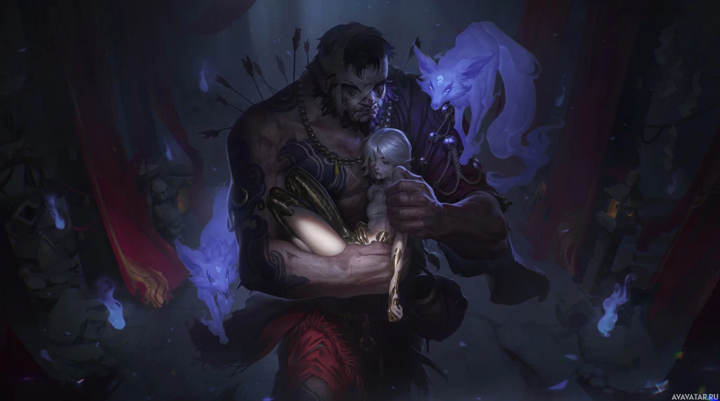 dark hair, and is wearing armor with a helmet that obscures his face. In his left hand, he holds a staff or rod. His right hand gently cradles the head of another character, who seems to be a child or