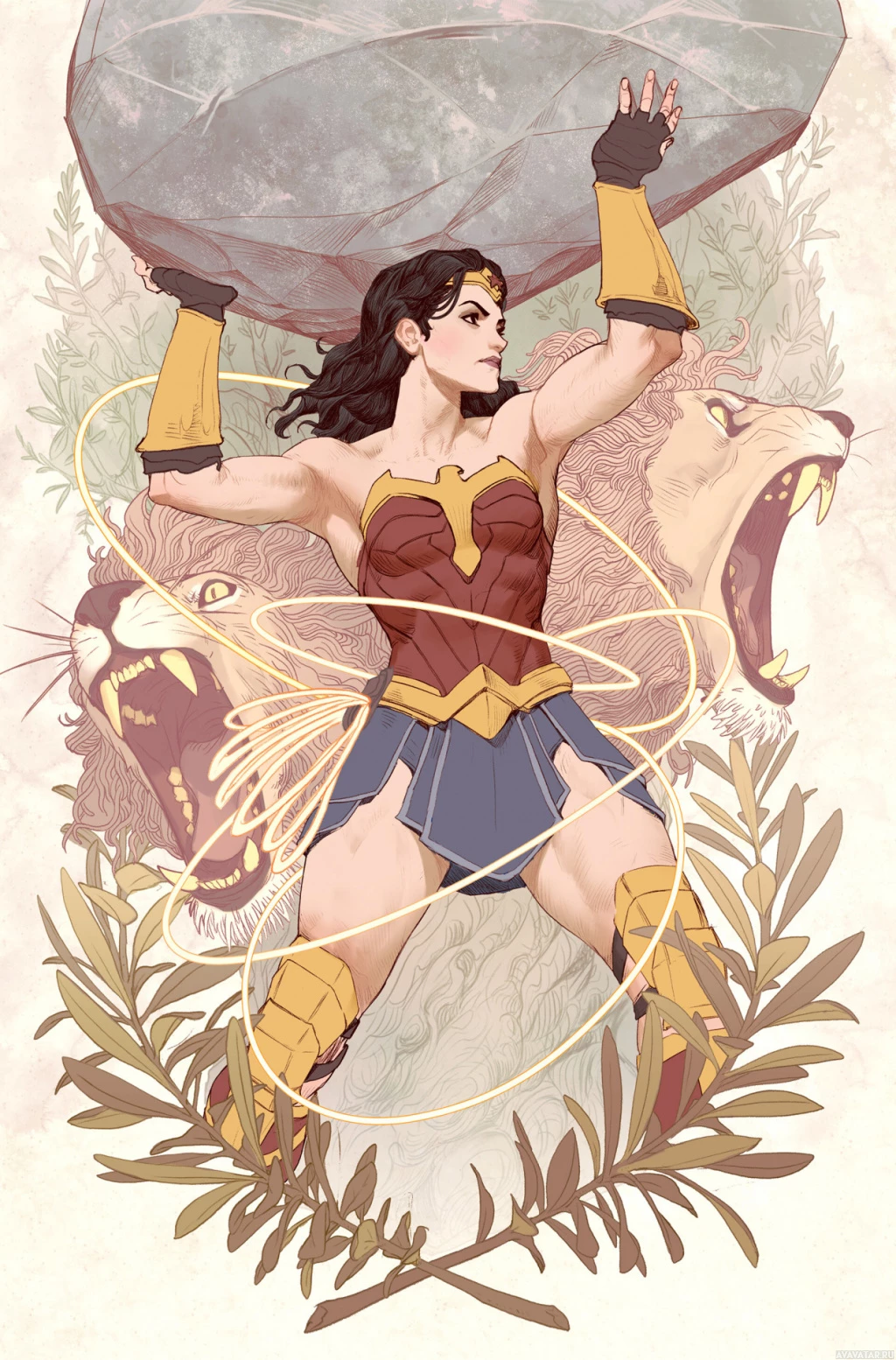 comic books. She is depicted with her iconic tiara, bracelets, and costume, holding