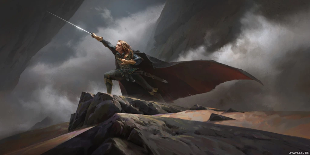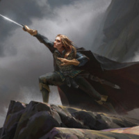 rocky terrain with her arm raised, holding a sword. She is wearing a cloak and her hair is styled blonde. The setting seems to be a fantasy or mythological landscape, possibly in the midst of a storm due to