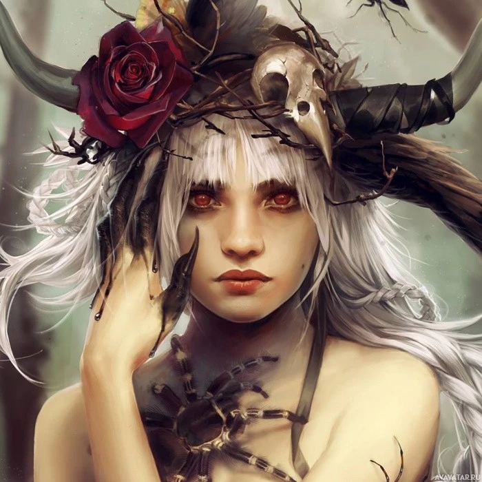 a touch of elegance or contrast to the macabre design. The character is adorned with various elements that seem to be inspired by nature, such as feathers, leaves, and possibly insects or arachnids. Her expression is neutral to mildly melancholic.