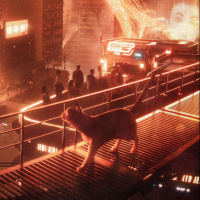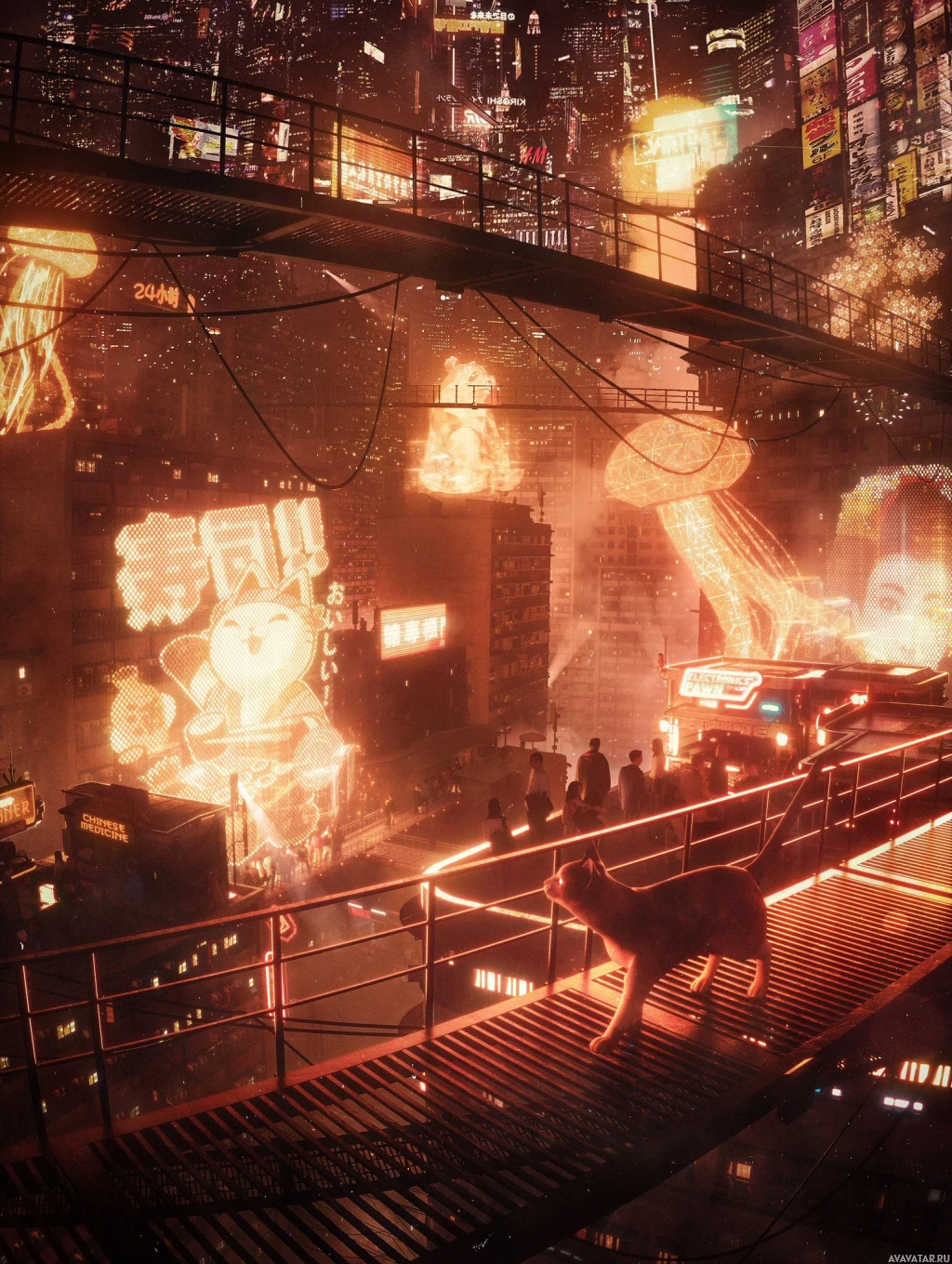urban environment that is likely advanced technologically. 2. A feline creature standing on a metal walkway, which seems to be a blend of an animal and a machine, commonly referred to as a "mech" in