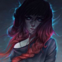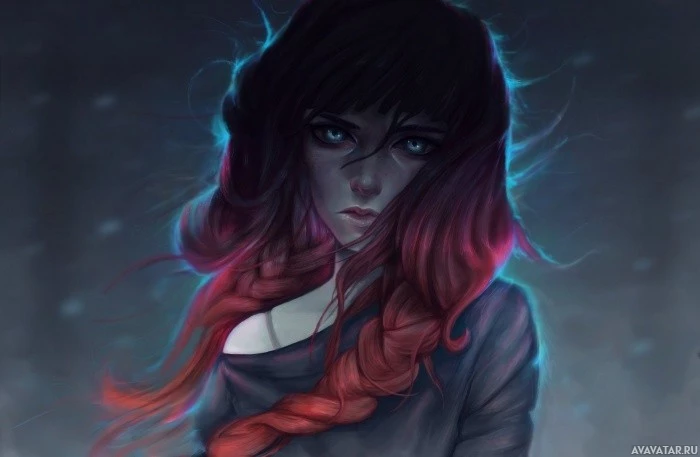 a female character with red hair styled in braids and adorned with blue accents. She has an expression that could be interpreted as sad or contemplative, looking off to the side rather than directly at the viewer. The background is dark, which contrasts with her brightly colored hair and makes her stand out more prominently in the image.
