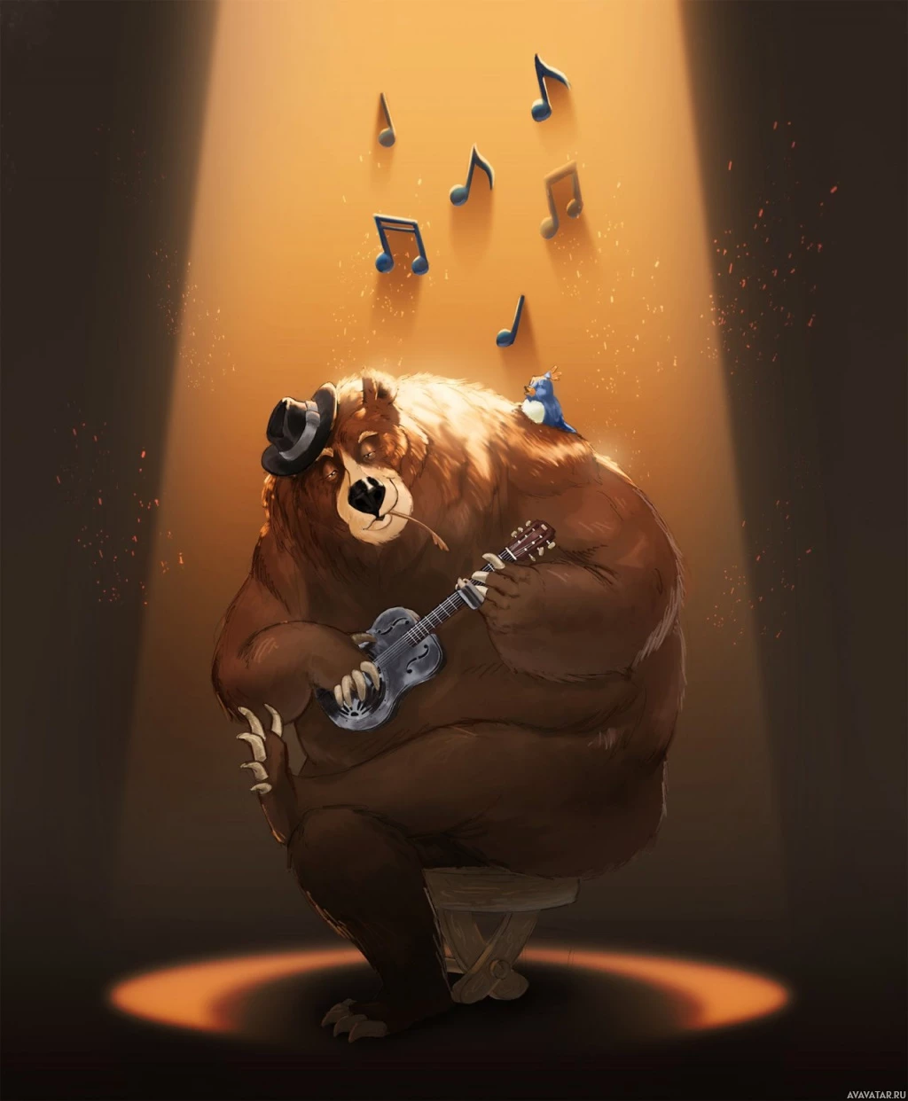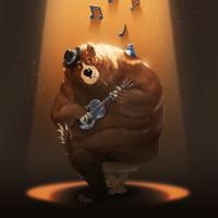 На картинке изображен медведь, сидящий на сцене. Он держит гитару и, кажется, играет или исполняет музыку. На заднем плане изображены парящие в воздухе музыкальные ноты, создающие атмосферу живого музыкального представления.