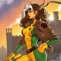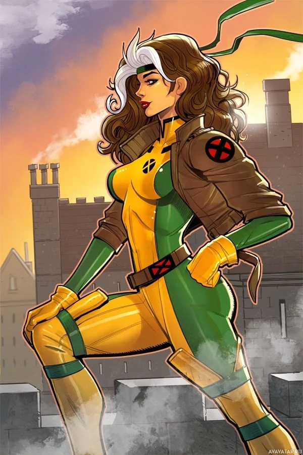iconic costume with green and yellow colors, complete with her white gloves that prevent her from touching others due to her ability to absorb powers. The background shows a cityscape at dusk or dawn, suggesting