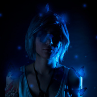 a blue tint and what seems like small glowing particles or lights floating around her head, which could be an artistic choice to create a specific mood or atmosphere.