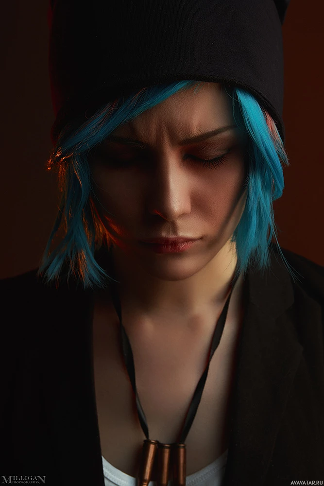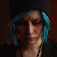 blue hair, looking downward and frowning. They are wearing a black beanie cap and what appears to be