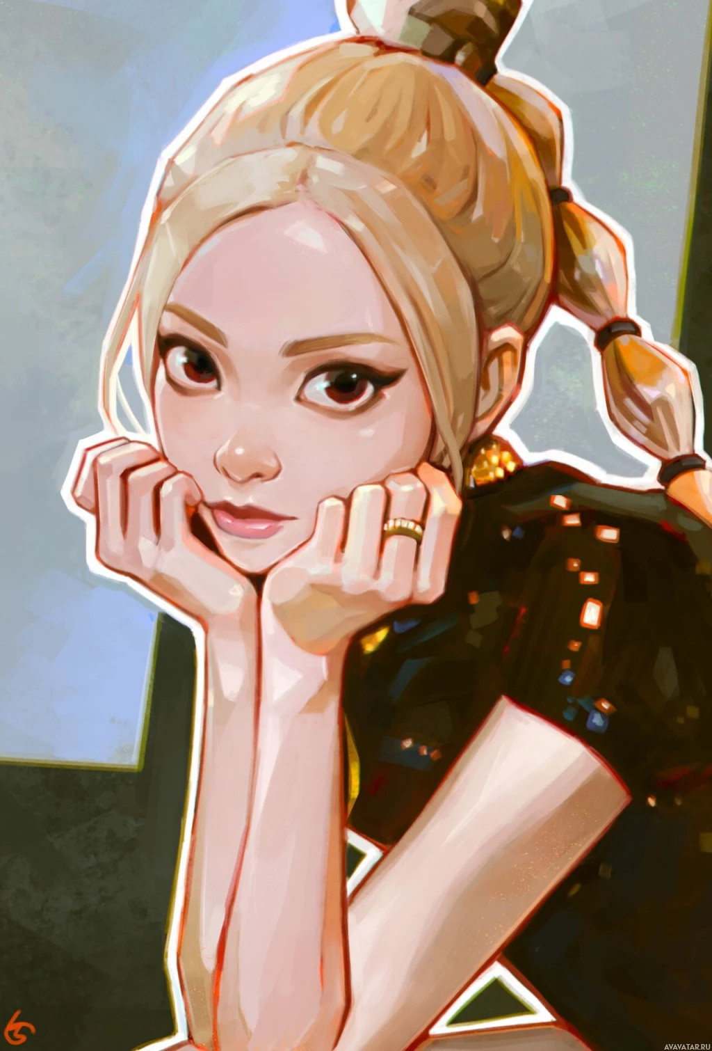 a black top and a yellow or gold accessory, possibly earrings. The girl has