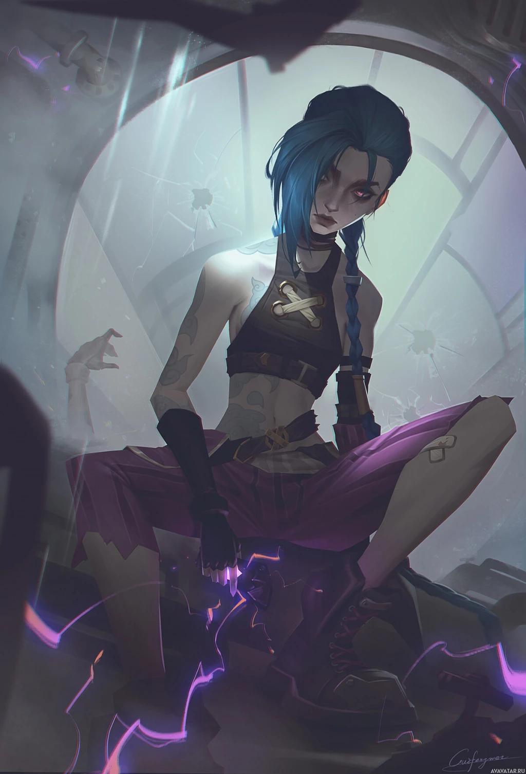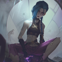 the video game "League of Legends" known as Jinx. She is depicted with her signature blue hair and a punk-style outfit, sitting on what appears to be rubble or debris in
