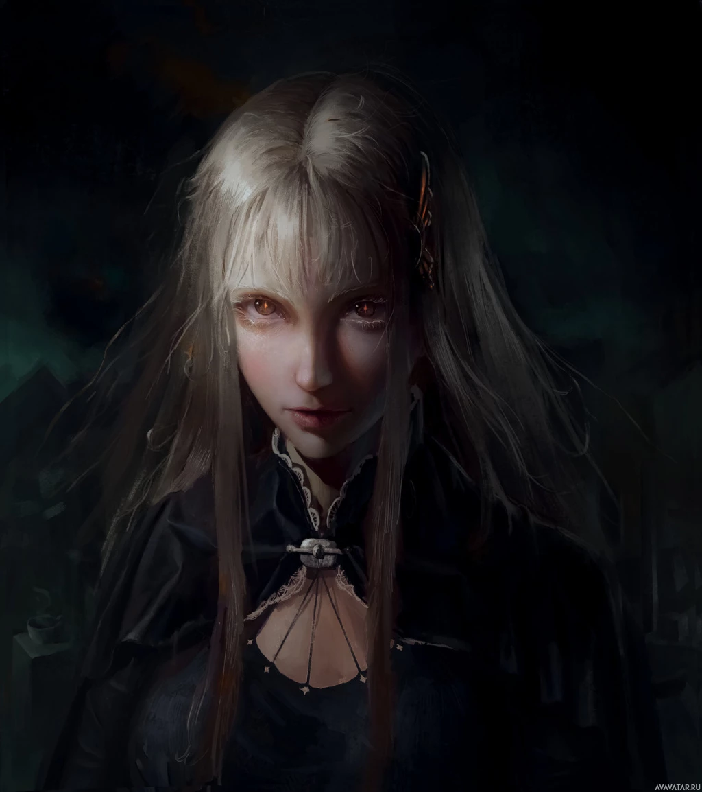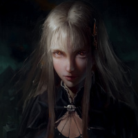 white hair and what appears to be a dark, gothic-style outfit. The character has a thoughtful or contemplative expression on her face. The artwork is detailed and evokes a sense of drama, possibly suggesting that this character is from a fantasy or