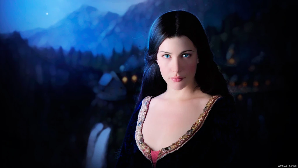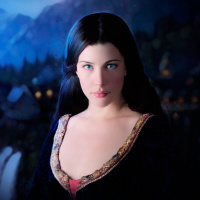 The image features a female character who appears to be from the "Lord of the Rings" franchise, specifically portraying Arwen. She is depicted in a setting that resembles Middle-earth, suggesting a scene from the movie series.