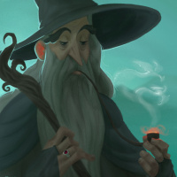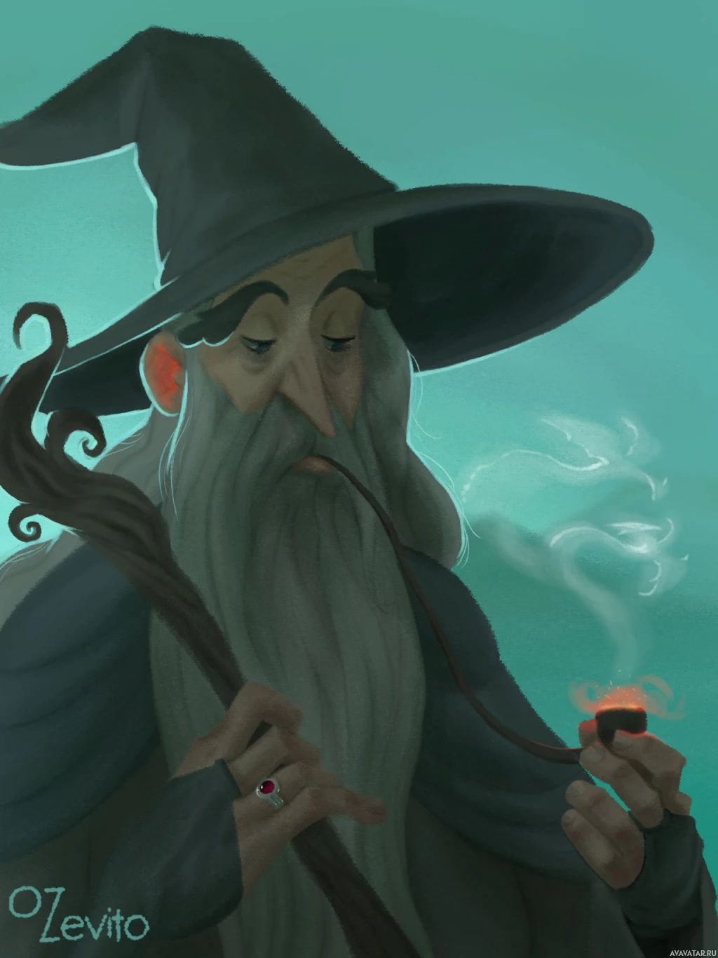 На картинке изображен анимационный персонаж, напоминающий Гэндальфа из сериала "Средиземье". Видно, что он держит трубку и находится в задумчивом состоянии, а из его трубки валит дым. Фон простой, с зеленым оттенком, который создает безмятежную или мистическую обстановку, типичную для фэнтезийных декораций.