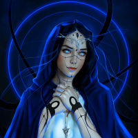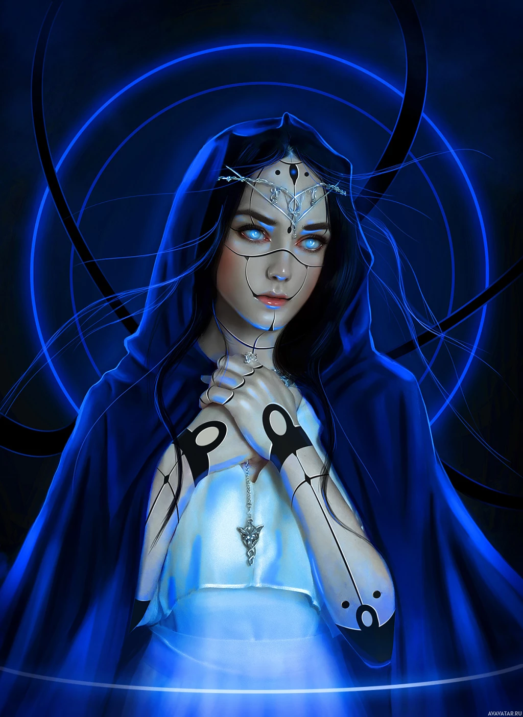 blue eyes and is adorned with tattoos that add to the otherworldly appearance. The background features