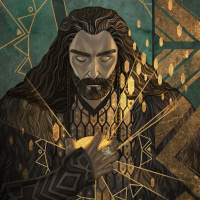 closed eyes, which could suggest he is in a state of contemplation or experiencing deep emotion. The background has Middle-earth motifs, including what seems to be elven script and patterns that are characteristic of the series' artwork. The overall impression is one of mysticism and wisdom often associated with the character's role as a guide and mentor within the story.