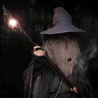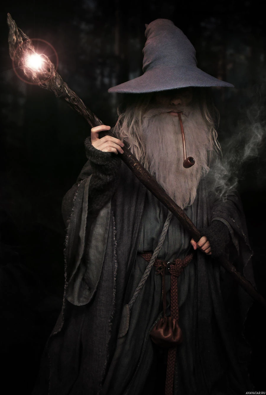 The image depicts a character that appears to be Gandalf from the "The Lord of the Rings" series. He is shown with a long