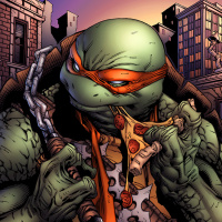 a slice of pizza and pointing with his other hand. Michelangelo is one of four