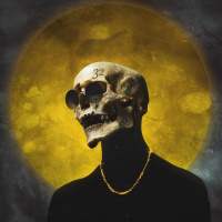 The image features a skull with a tattoo on its forehead, which is set against an artistic background that includes a yellow hue and what appears to be a cloud or circular element in the sky. The figure is wearing sunglasses and has a necklace around its neck. It is presented in a stylized manner typical of certain subcultures or artistic expressions.