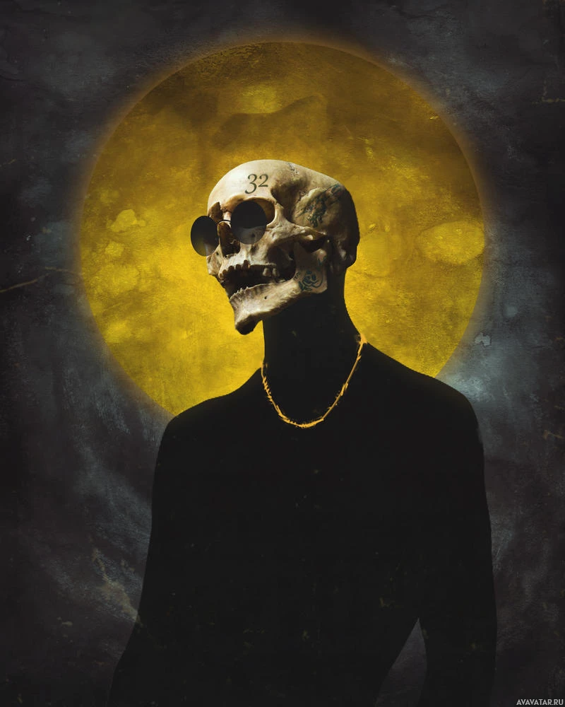 На картинке изображен череп с татуировкой на лбу, который расположен на художественном фоне, включающем желтый оттенок и что-то похожее на облако или круглый элемент в небе. На фигуре надеты солнцезащитные очки, а на шее у нее ожерелье. Она представлена в стилизованной манере, характерной для определенных субкультур или художественных выражений.