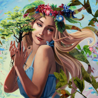 the plant life, possibly tending to plants or picking flowers, as she seems to be holding something small between her fingers. The art style is impressionistic with