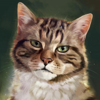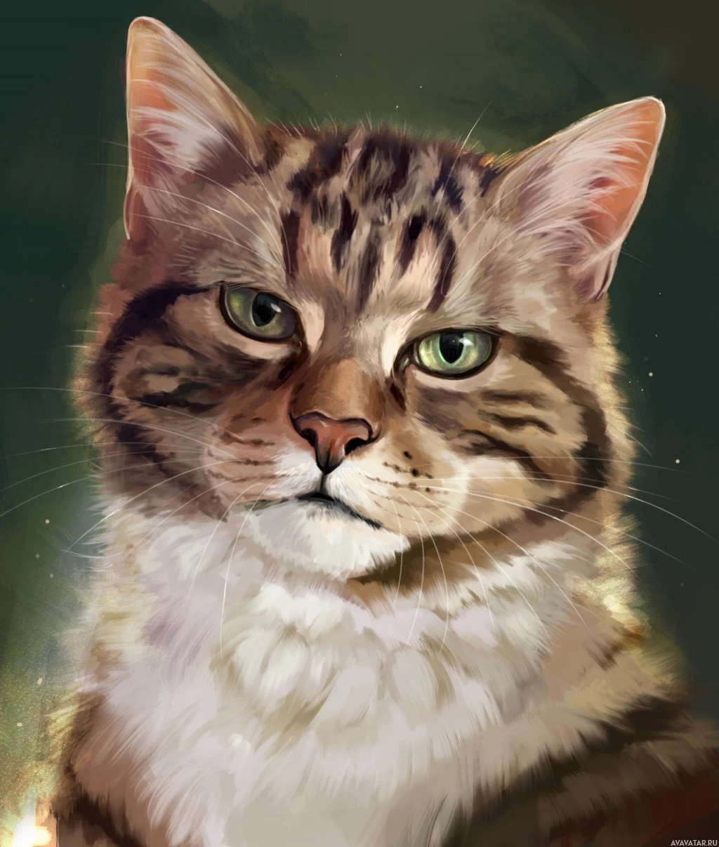На картинке изображена кошка с полосатой шерстью. Кажется, что она стилизована или нарисована в художественной манере, с четкими контурами и растушевкой, которые придают ей объемный вид. Выражение кошачьей морды несколько угрюмое или серьезное.