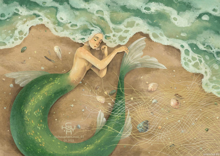 На картинке изображена русалка, лежащая на пляже с закрытыми глазами в окружении ракушек и гальки. Это произведение искусства в стиле фэнтези, в котором сочетаются человеческие и водные элементы. На заднем плане изображена прибрежная обстановка с волнами, мягко набегающими на берег.