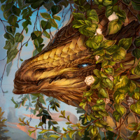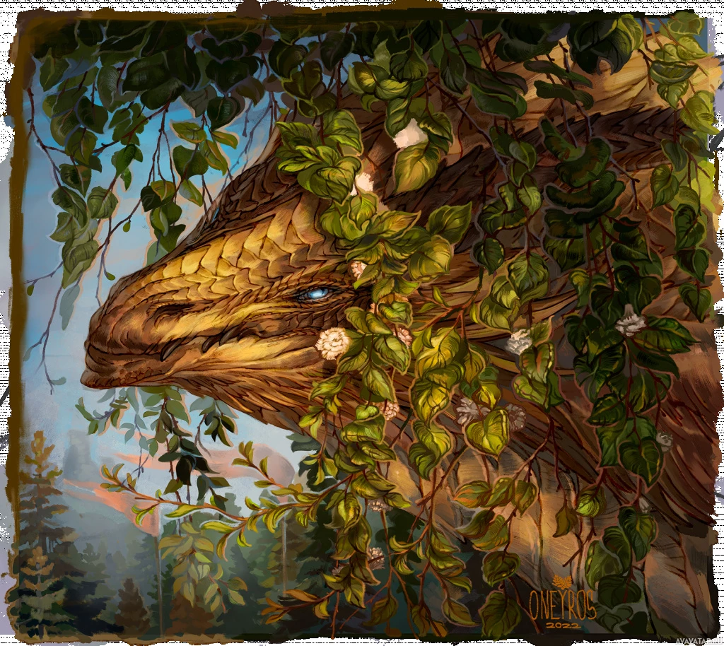 a fantasy dragon. It is a stylized illustration of the creature surrounded by lush green foliage, suggesting