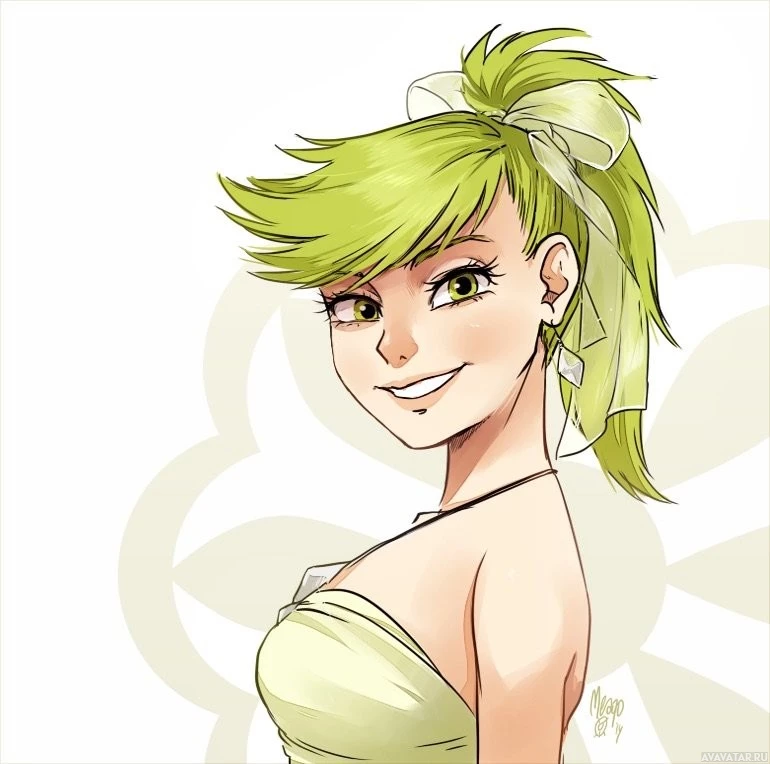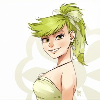 a yellow flower in the background behind her left shoulder. The style of the artwork indicates that it may be from an animated show or a manga comic, as indicated by the use of