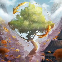 central tree, there is a flurry of leaves falling from above, suggesting a change in seasons or a magical occurrence. In the background, there are traditional-style buildings that appear to be Japanese temples or shrines, adding an oriental feel to the scene. The setting suggests a harmony between nature and human habitation, with the tree at the center being