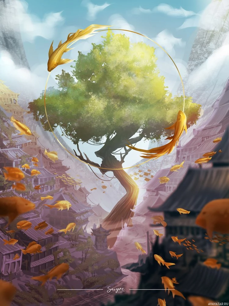a tree in the center with its roots extending downwards, creating a natural anchor for the landscape. Around this