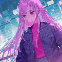 a pink top or shirt. There is a blurred cityscape background that gives off a neon-lit ambiance, reminiscent of