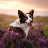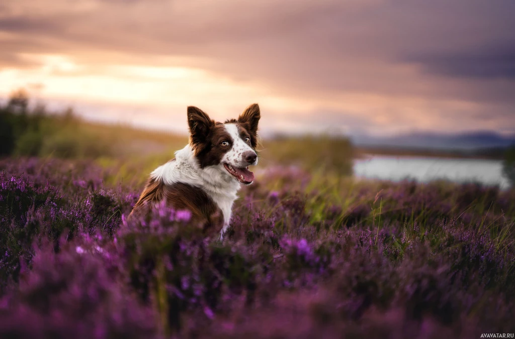 a scenic backdrop. The sky is painted with colors that suggest either sunrise or sunset. Behind the dog are fields of