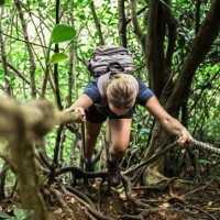 In the image, there is a woman trekking through what appears to be a dense forest. She has her backpack on and seems to be making her way along a path that is not well-defined due to the overgrowth of vegetation. The terrain suggests it could be a jungle or a heavily forested area.