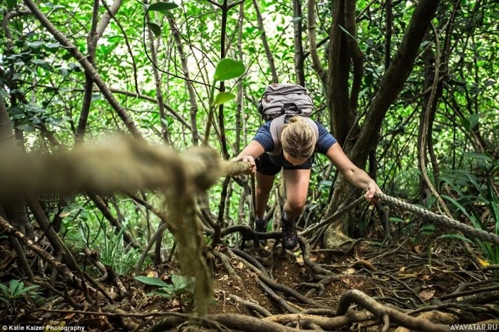На картинке изображена женщина, путешествующая по тому, что кажется густым лесом. У нее есть рюкзак и, кажется, она прокладывает себе путь по пути, который не очень четко определен из-за чрезмерного роста растительности. Местность предполагает, что это могут быть джунгли или сильно лесистая местность.