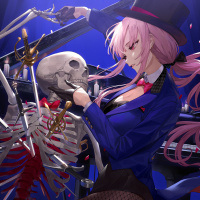 the skeletal structure of a figure, possibly as part of her act or performance. The scene suggests a circus-like setting and has a dramatic or ominous atmosphere. The character's expression and attire give off an eccentric or mysterious vibe.