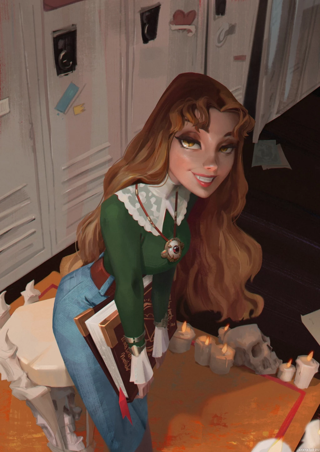 The image depicts a red-haired girl with a smile on her face. She is sitting in front of what appears to be lockers, and there are lit candles nearby, creating a warm and cozy atmosphere. The girl is dressed casually in jeans and a top, suggesting a relaxed or informal setting.