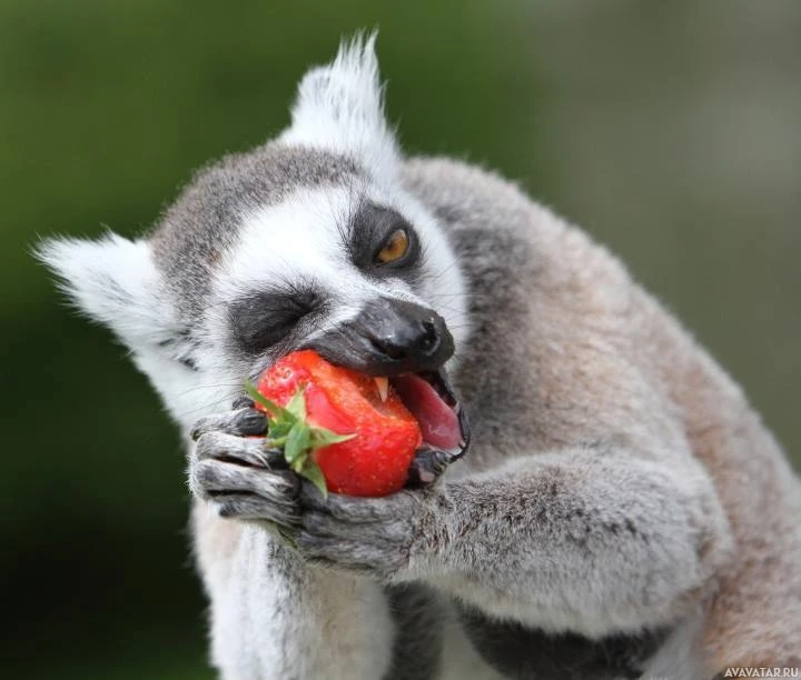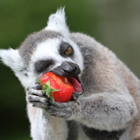 a small primate, eating a strawberry. Lemurs are known for their distinctive