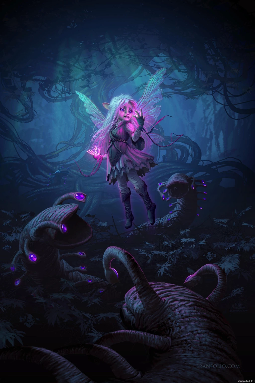 the magical ambiance of the setting. In the foreground, there are two creatures that could be interpreted as snakes or slithers due to their elongated bodies, but they have
