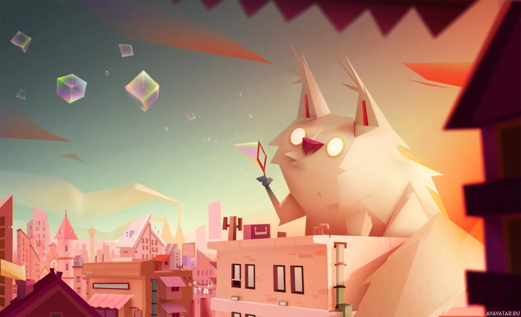 The image depicts an artistic and surreal scene featuring a monster with the body of a cat, perched on top of