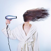 a white robe and holding a hairdryer, with their hair appearing to be in motion as if being blown back by the air. The background is plain, which might suggest