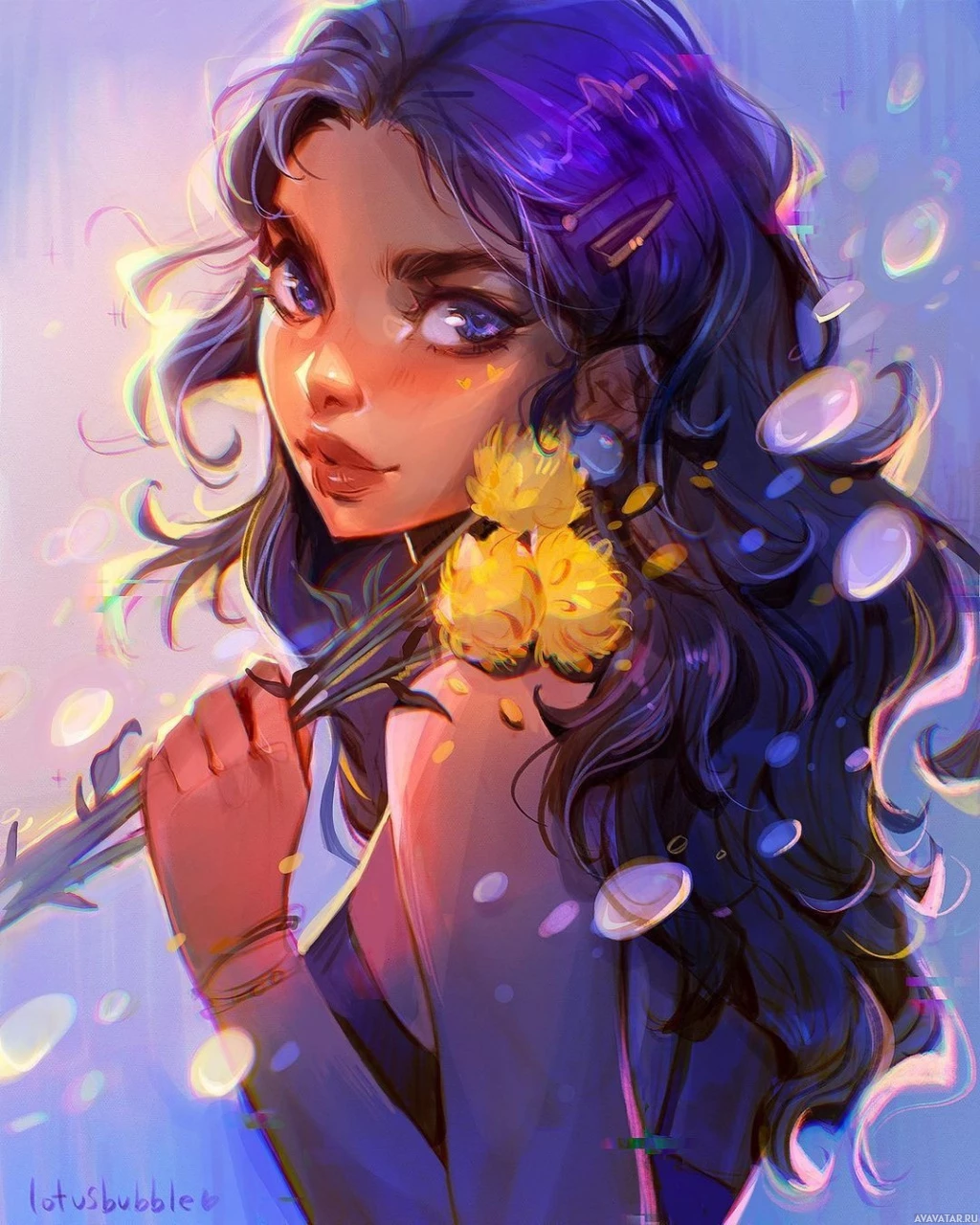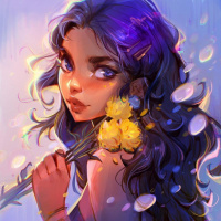 a yellow flower in her hand and wearing what appears to be a dress with a long train. The background suggests a magical or dreamlike environment, possibly representing