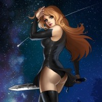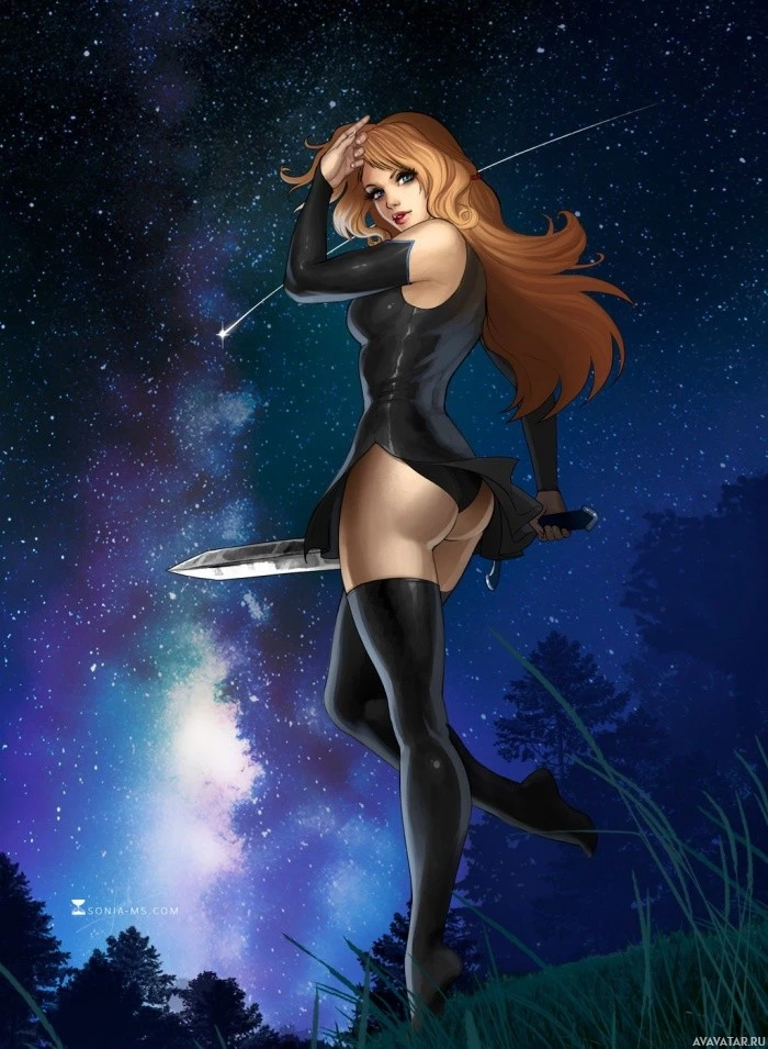 blonde hair and is wearing a black outfit, possibly armor or a bodysuit. In her hand, she holds a sword. The background features a starry