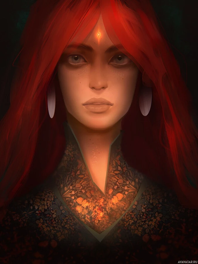 a female character with striking red hair. She has a calm expression and is wearing what appears to be an ornate garment or armor, suggesting she might be from