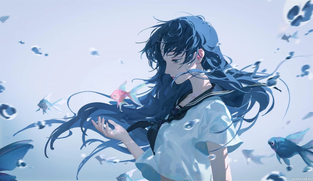blue hair. The girl appears to be surrounded by fish, suggesting she might have an affinity or connection with
