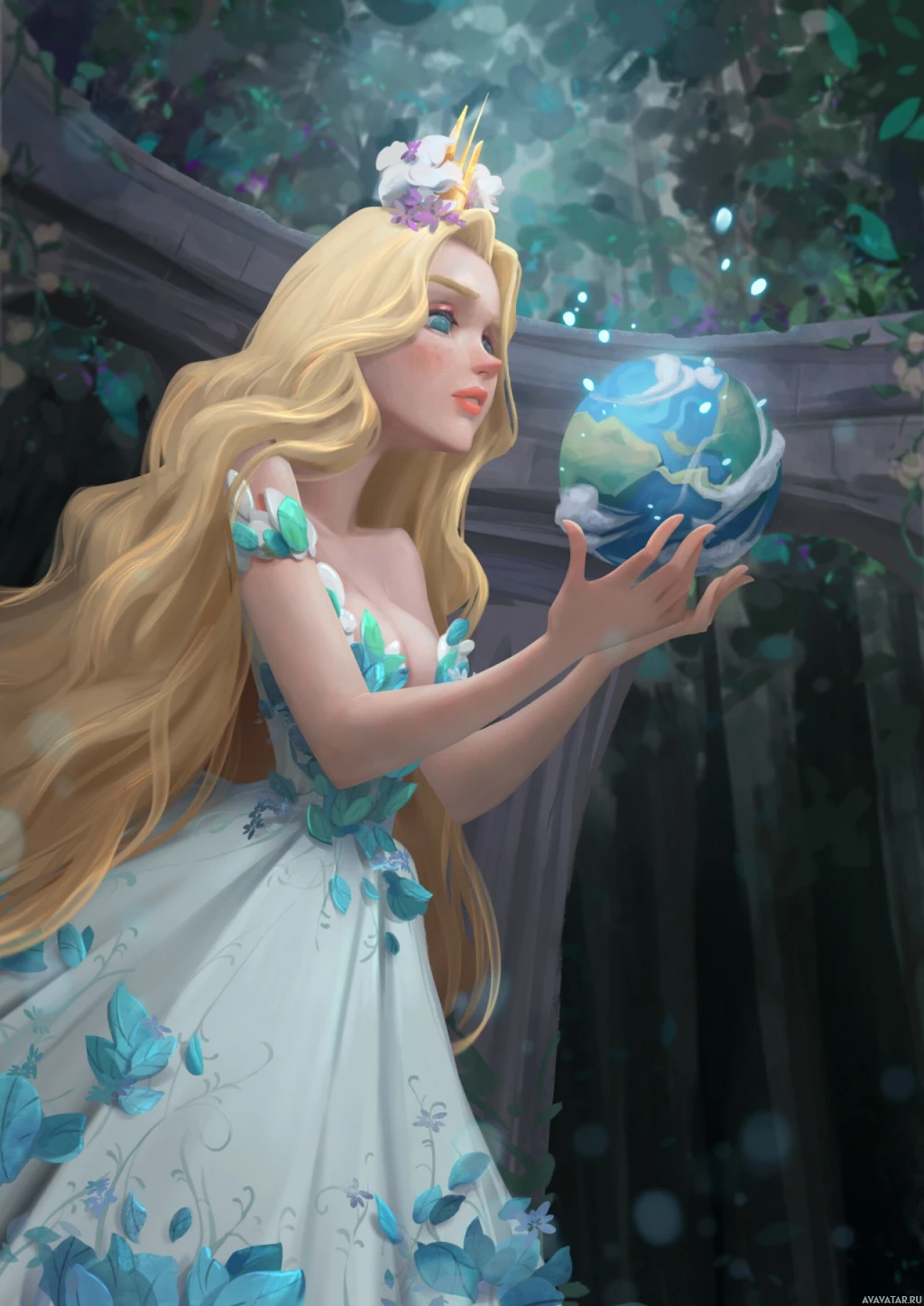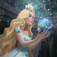 blonde hair, dressed in what appears to be a fairy tale costume. She is holding a globe that seems to represent the Earth, and there are elements of nature around her, such as flowers on her dress and butterflies nearby. The setting has a mystical or magical feel, with greenery and lighting that suggests