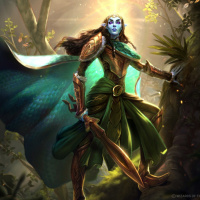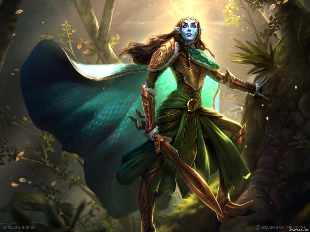 a fantasy setting. The character is wearing green armor with gold accents and has elven features, including pointed ears,