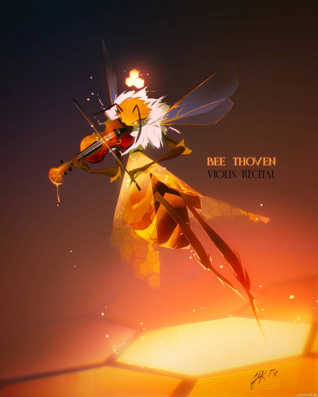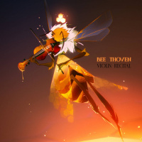 an animated character that is a bee, dressed as a musician playing the violin. This character seems to be depicted in a whimsical and artistic style. There are also honeycomb shapes visible around the bee's body and wings, enhancing the insect theme of the character. The background has warm,