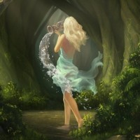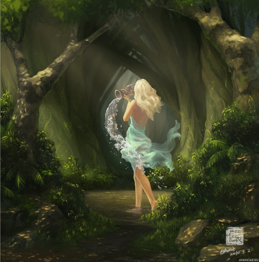 the water droplets around her and the peaceful ambiance of the scene. The setting suggests a serene