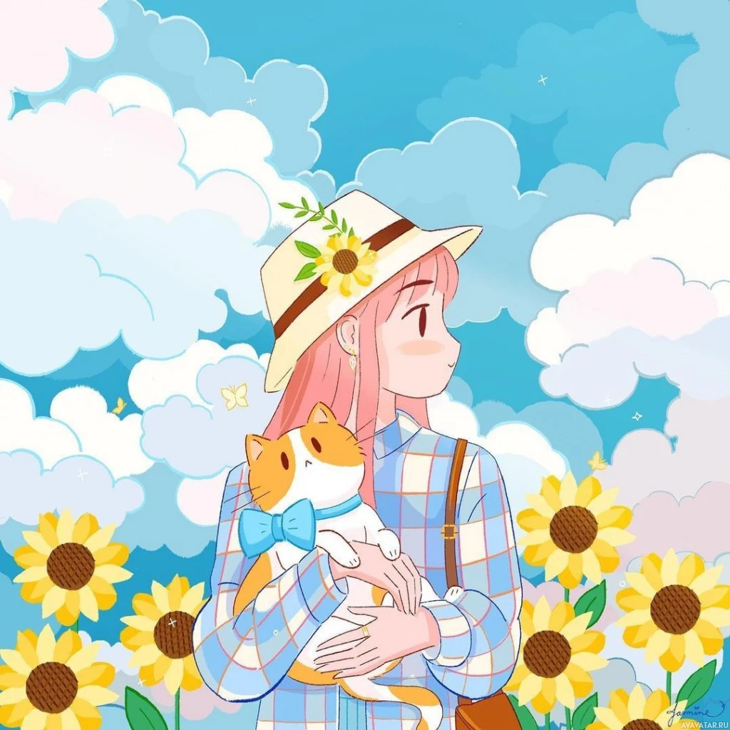 pink hair, wearing a brown hat with flowers and sunglasses. She is holding a cat that appears to be