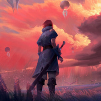 a female character with red hair, seen from behind. She is standing in what appears to be a fantasy or otherworldly landscape with a vibrant sky and clouds, possibly suggesting a scene from